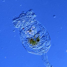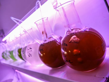 En effet, 6 espèces de phytoplancton (algues vertes et brunes) sont en permanence cultivées par repiquage de tubes souche et dilution dans de l’eau de mer stérile. Ce premier maillon permettra d’alimenter des rotifères et des artémias qui sont les 2 espèces de zooplancton dont se nourrit la larve de turbot qui est carnivore.